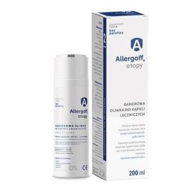Allergoff barierowa oliwka do kąpieli leczniczych, 200 ml wyrób medyczny, pielęgnujący i natłuszczający skórę atopową. Tworzy barierę ochronną na powierzchni skóry, która łagodzi objawy dermatoz różnego pochodzenia. Nie zawiera parafiny, surowców ropopodobnych, ani substancji zapachowych czy barwników.