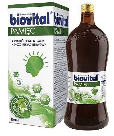 Biovital Pamięć suplement diety w postaci płynu do picia. Zawiera witaminę B2, która wspomaga prawidłowe funkcjonowanie układy nerwowego oraz przyczynia się do zmniejszenia uczucia zmęczenia i znużenia. Polecany do stosowania dla osób dorosłych.