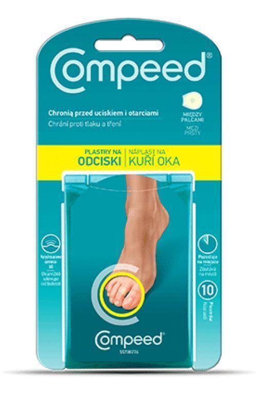 Plastry na odciski między palcami Compeed to wyrób medyczny zawierający aktywny żel hydrokoloidowy, który przynosi natychmiastową ulgę w bólu i pomaga usunąć odcisk. Zapewnia błyskawiczną ulgę w bólu dzięki grubej wyściełanej warstwie, która szybko znosi nacisk powodujący powstanie odcisku. Wodoodporny i oddychający plaster dzięki swoim ultraprzylepnym i wymodelowanym krawędziom elastycznie dopasowuje się do ruchów i pozostaje na miejscu, chroniąc przed dalszym tarciem.
