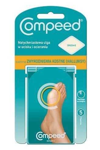 Plastry na zwyrodnienia kostne (halluksy) średnie Compeed wyrób medyczny, natychmiast uśmierzają ból wywołany uciskiem i ocieraniem. Zabezpieczają przed powstaniem pęcherzy oraz stwardniałej skóry na halluksach. Pozostają na miejscu przez kilka dni. Stworzone przy użyciu technologii hydrokoloidu Compeed – aktywnego żelu wspomagającego nawilżanie.