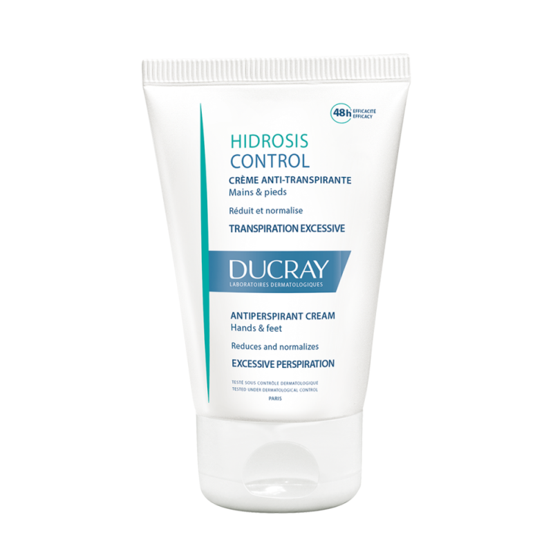 DUCRAY Hidrosis Control kremowy antyperspirant dobrze tolerowany przez skórę zawiera 87% składników o pochodzeniu naturalnym. Doskonały nawet do najbardziej wrażliwej skóry. Przeciwdziała potliwości skóry dłoni i stóp do 48 godzin.