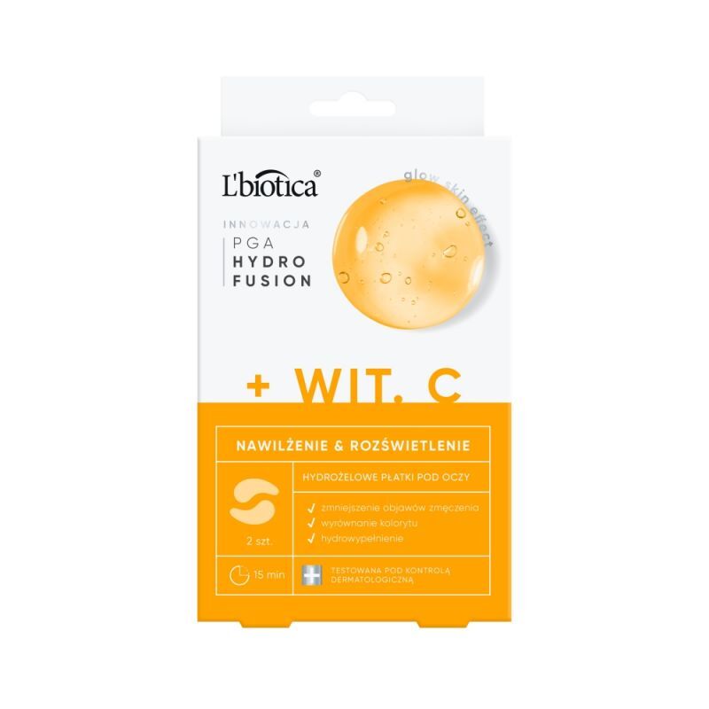 Hydrożelowe płatki pod oczy z witaminą C L'Biotica PGA Hydro Fusion z aktywną hydroformułą zawierającą kwas poliglutaminowy SynerPGAHydroPower+, witaminę C, ekstrakt z lukrecji oraz Microbiom Dermoprotect CPLX natychmiastowo rozświetlają okolice oka, redukują objawy zmęczenia i niewyspania. Już po pierwszym użyciu skóra zyskuje zdrowy wygląd, pełen blasku.