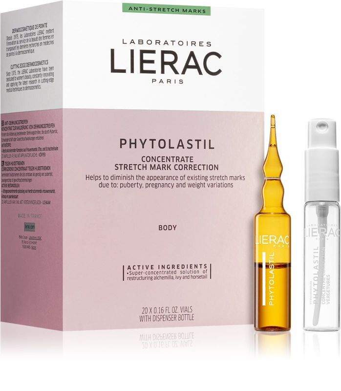 Lierac Phytolastil serum korygujące rozstępy, 20 ampułek x 5 ml to produkt stworzony z myślą o kobietach zmagających się z problemem rozstępów na skórze. Dzięki swojej unikalnej recepturze skutecznie zmniejsza widoczność rozstępów. Połączenie 3 składników aktywnych- skrzypu bluszczu i przywrotnika, regeneruje uszkodzone włókna kolagenowe i elastynowe, w efekcie spłyca rozstępy i wyrównuje ich koloryt.