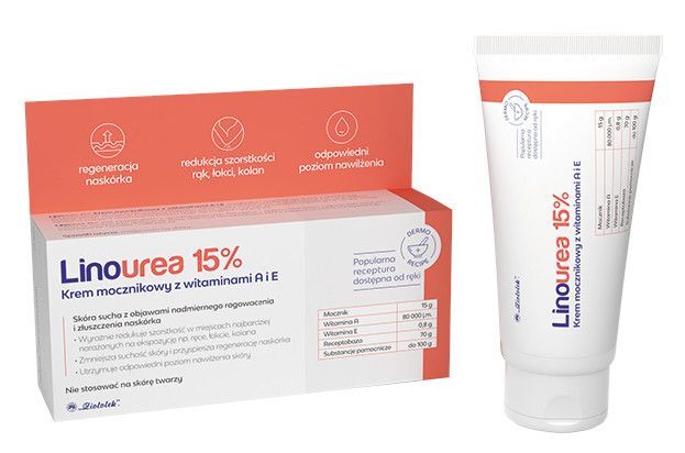 Linourea 15% Krem mocznikowy z witaminami A i E do pielęgnacji problematycznych partii ciała podatnych na szorstkość, przesuszenie i łuszczenie (kolana, łokcie, dłonie).