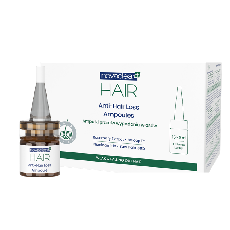 Ampułki przeciw wypadaniu włosów Novaclear Hair to intensywna kuracja w ampułkach, która wspiera redukcję wypadania włosów i poprawia ich gęstość, działając bezpośrednio u źródła problemu. Kompleks składników aktywnych, takich jak Baicapil, ekstrakt z rozmarynu czy palmy sabałowej, wzmacniaja cebulki i stymuluje wzrost nowych, mocniejszych włosów. Dodatek pantenolu, niacynamidu i ekstraktu z pokrzywy dba o zdrową, dobrze nawilżoną skórę głowy, tworząc idealne warunki do ich regeneracji. Lekka formuła nie obciąża pasm, pozostawiając je pełne blasku i naturalnej objętości.
