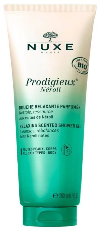 Żel pod prysznic Nuxe Prodigieux Neroli o zapachu pomarańczy, bergamotki i lawendy. Delikatnie oczyszcza ciało, pozostawiając skórę miękką i zrelaksowaną. Zawiera 98% składników pochodzenia naturalnego. Certyfikowany produkt BIO. Formuła wegańska.