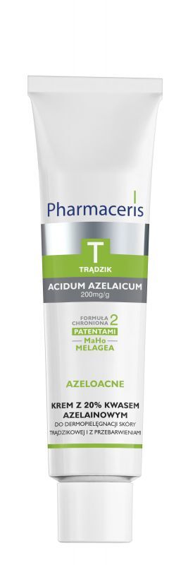 Pharmaceris T Azeloacne Krem z 20% kwasem azelainowym do dermopielęgnacji skóry trądzikowej i z przebarwieniami to specjalistyczny krem do codziennej dermopielęgnacji skóry ze zmianami trądzikowymi o umiarkowanym i intensywnym nasileniu, w tym dla skóry z trądzikiem różowatym.