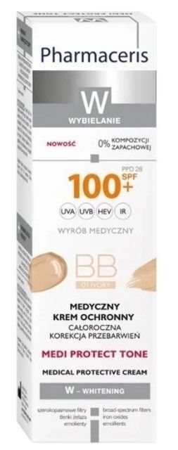 Krem medyczny ochronny 01 Ivory, Całoroczna korekcja przebarwień, SPF 100+ Pharmaceris W Medi Protect Tone BB wyrób medyczny to krem z szerokopasmową ochroną przeciwsłoneczną SPF 100+ dla osób z zaburzeniami pigmentacji oraz nadwrażliwością na promieniowanie słoneczne. Delikatnie maskuje przebarwienia i nierówny koloryt skóry. Krem tworzy mechaniczną barierę ograniczającą dostęp promieniowania zmniejszając ryzyko rozwoju rogowacenia słonecznego oraz nieczerniakowych nowotworów skóry.
