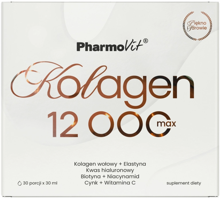 Pharmovit Kolagen 12000 Max suplement diety w formie płynu doustnego o smaku owoców tropikalnych. Polecany do stosowania dla osób dorosłych.