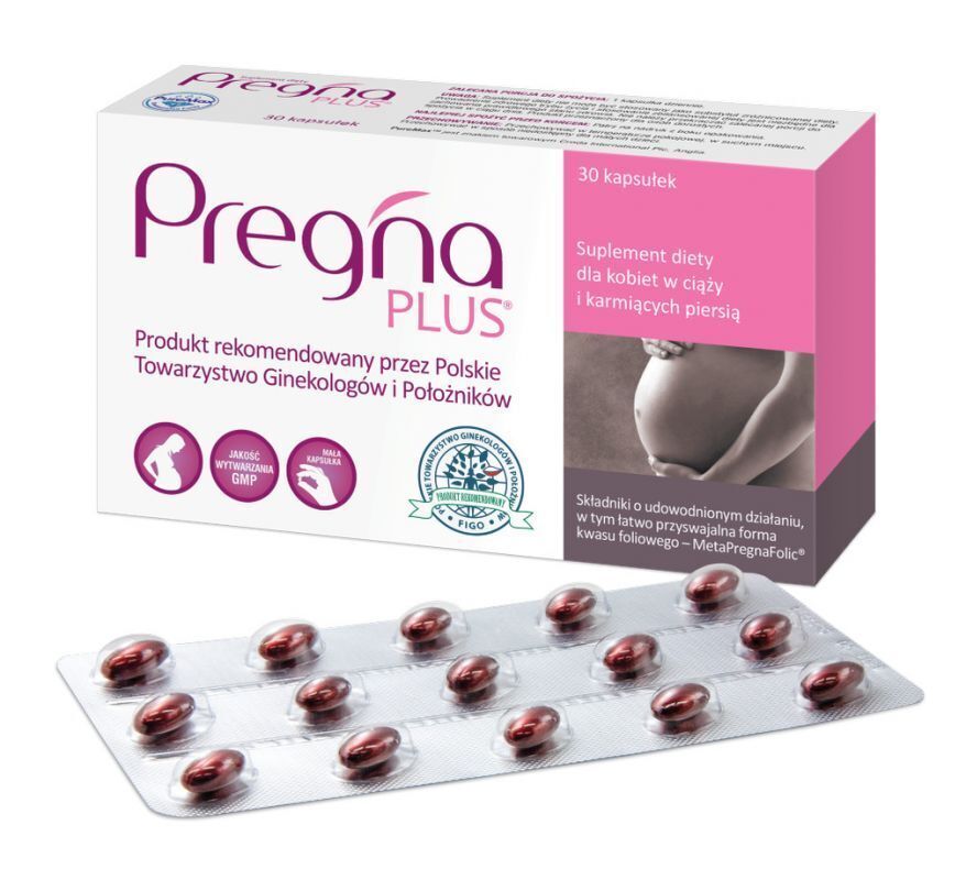 Pregna Plus suplement diety dla kobiet w ciąży i planujących ciąże. Zawiera starannie dobrany zestaw najważniejszych składników m.in.: kwas foliowy, żelazo i witaminę D3. Wspomaga prawidłowe funkcjonowanie układu nerwowego oraz immunologicznego. Przyczynia się do prawidłowej produkcji czerwonych krwinek.