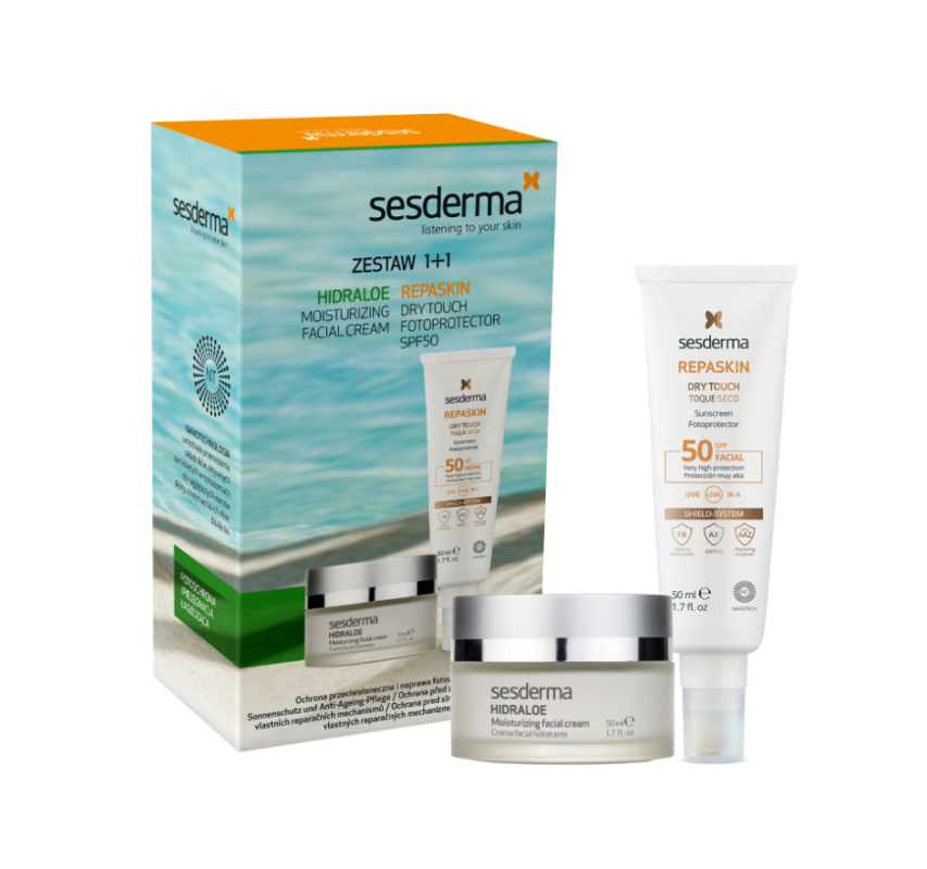 • Sesderma Repaskin Dry Touch Fotoprotektor do twarzy SPF50, 50 ml + Hidraloe Krem nawilżający, 50 ml