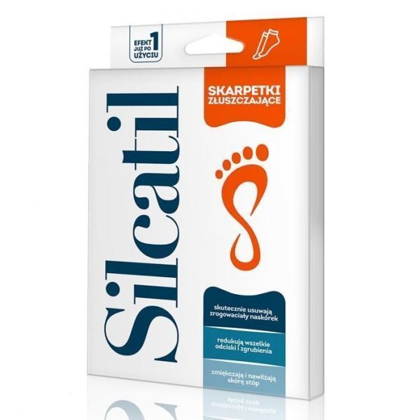 Skarpetki złuszczające Silcatil to złuszczający produkt do pielęgnacji stóp. Nasączone płynem keratolitycznym, skutecznie usuwają zrogowaciały naskórek oraz redukują odciski i zgrubienia. Zawierają kwasy: glikolowy, salicylowy, mlekowy oraz mocznik, który dba o odpowiedni poziom nawilżenia.