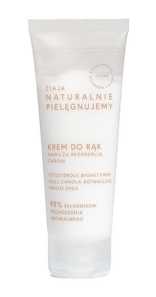 Ziaja Naturalnie Pielęgnujemy krem do rąk skutecznie nawilża, niweluje suchość, pielęgnuje, regeneruje oraz ochrania wrażliwą skórę dłoni. Jego receptura oparta jest na oliwkowej aktywności fitosteroli, tokoferoli i lipidów oraz roślinnych sterolach z oleju canola i masła shea. Bogaty w 99% składników pochodzenia naturalnego. Produkt wegański.