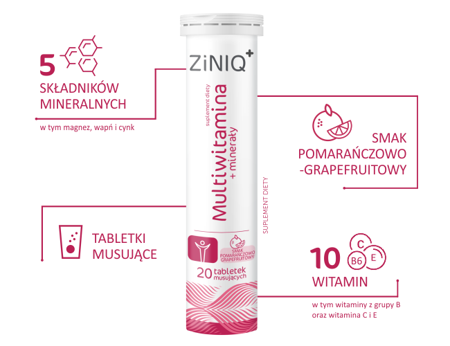ZiNIQ+ Multiwitamina + minerały to suplement diety o bogatym i zrównoważonym składzie. Zawiera kompleks 10 witamin i 5 składników mineralnych. Rozpuszczalna forma tabletek musujących o orzeźwiającym smaku pomarańczowo-grapefruitowym jest wygodna do stosowania i sprzyja szybkiemu wchłanianiu zawartych w składzie składników witaminowych i mineralnych.
